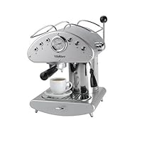 Retro stainless steel style design, ground coffee and pod portafilter handles included, free Illy coffee pods included, milk steamer/frother, pump driven boiler, 15 bars of pressure, removable 0.7 liter water tank, cup warmer, built-in drip tray, espresso temperature gauge, high pressure safety valve, on/off ready lights, cord storage, 1000 watts, made in Italy.
