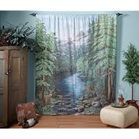 Woodland Crossing Window Art panel pairs offer a peaceful scene featuring deer relaxing at a tranquil stream in an evergreen forest with majestic snowcapped mountains in the background.The panels are easy care 55% polyester/ 45% cotton and are machine washable.The 72x84 panels cover windows to 70" wide.Imported.