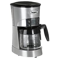 With its sleek contemporary styling, this 12-cup coffeemaker features an advanced no-scorch heater that maintains coffee's just-brewed temperature for fresh flavor, cup after cup. This high-performance appliance is handy when serving a small crowd with its ability to brew in less than a minute per cup, when brewing 12 cups. And for pouring a cup before the brew cycle is complete, the unit is designed with a handy brew-pause feature. Other conveniences include its programmable clock/timer that allows for waking up to fresh coffee, as well as its two-hour automatic shut-off function for worry-free brewing. The included carafe is specially designed to prevents drips and spills when pouring a cup or filling the reservoir. Available in a variety of fashionable colors, the contemporary-looking 1100-watt coffeemaker measures approximately 8 by 11 by 14 inches and carries a three-year warranty.
