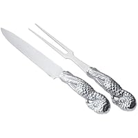 Arthur Court\'s two-piece turkey carving set makes a fitting addition to a Thanksgiving feast or a fun complement to any night poultry is featured on the menu. The handcrafted set includes a carving knife and two-prong serving fork, each with elongated working ends and ornate figural handles realistically shaped like turkeys. The utensils feature hand-polished premium tarnish-resistant aluminum alloy handles and stainless-steel working ends for strength and durability. Each measures 11 inches long; hand wash only to protect the bright finish.