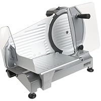 Chef'sChoice Professional Electric Food Slicer - 9.8" BladeThis rugged commercial-quality slicer meets the needs of busy home cooks, sportsmen, caterers and chefs. It operates at peak power of over 1/4 horsepower and features die-cast metal construction and precision thickness control to slice from deli-thin to 1/2 inch. The powerful, high-quality, quiet induction motor and tilted design are perfect for your toughest slicing tasks. The large, commercial-quality 9.8"diameter, fully hardened, fine edge, stainless steel blade slices meats, cheeses, vegetables, breads and fruits quickly and effortlessly. It features an extra large capacity food carriage that rides smoothly on industrial bearings. Rubber feet secure the slicer to the work surface and a double control on-off switch is built in for added safety. A blade sharpener, a tool for easy blade removal and a serving tray are included. One year limited warranty. 20.3" L x 15.1" W x 13.8" H. Weight - 31.6 lbs.